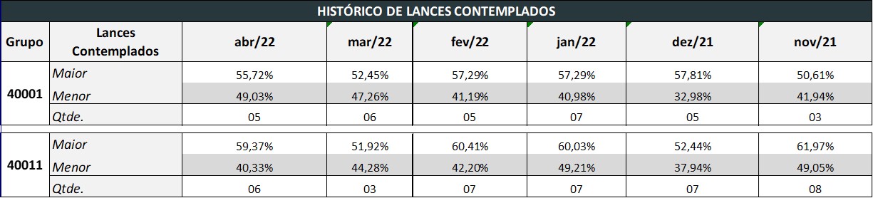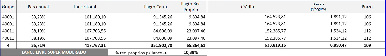 Será ofertado um percentual de lance que seria contemplado em 4 dos últimos 6 meses, de acordo com o histórico de lances do grupo, adicionamos 0,25% para quebra de empate.