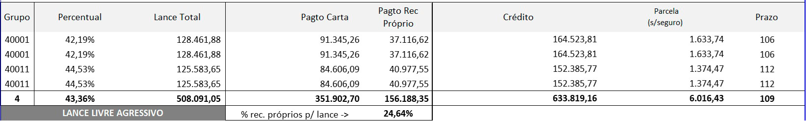 Será ofertado o lance fixo com percentual de 20% do saldo devedor, ao contemplar, podemos pagar o lance utilizando parte da própria carta de crédito, eliminando a necessidade de desembolsar recursos próprios + acompanhamento dos resultados dos sorteios.